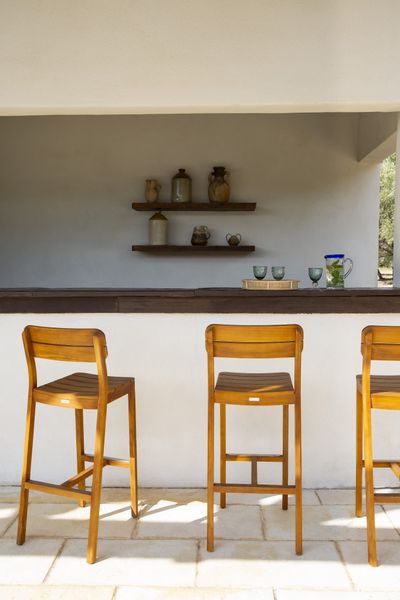 Gỗ teak từ lâu đã nổi tiếng là loại gỗ cao cấp dành cho nội thất ngoài trời nhờ độ bền vượt trội, khả năng chống nước và chống mối mọt. Những chiếc ghế quầy bar bằng gỗ teak mang đến vẻ đẹp sang trọng, gần gũi với thiên nhiên và có thể tồn tại hàng chục năm nếu được bảo dưỡng đúng cách. Thiết kế ghế thường đơn giản, chắc chắn, với gam màu nâu trầm ấm áp, phù hợp cho không gian biệt thự hoặc resort cao cấp. Đây là lựa chọn hàng đầu cho những ai muốn sở hữu không gian bar ngoài trời đẳng cấp nhưng vẫn giữ được sự mộc mạc tinh tế.